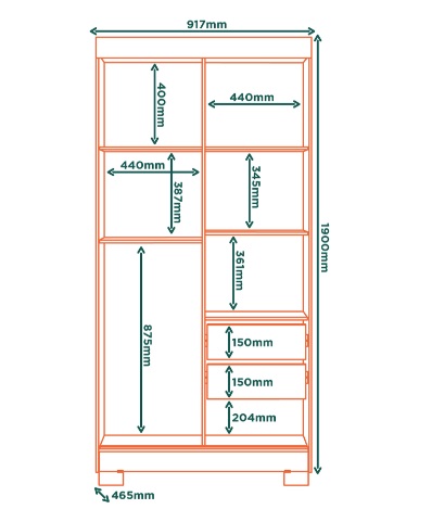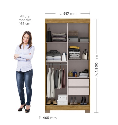 Apesar da sua largura reduzida, os 1,90 metros de altura permitem a acomodação de todos os seus itens. São 2 gavetas espaçosas e diversas prateleiras para você se organizar como preferir. Além disso, este produto conta com um cabideiro para pendurar todo tipo de roupa.